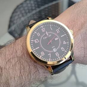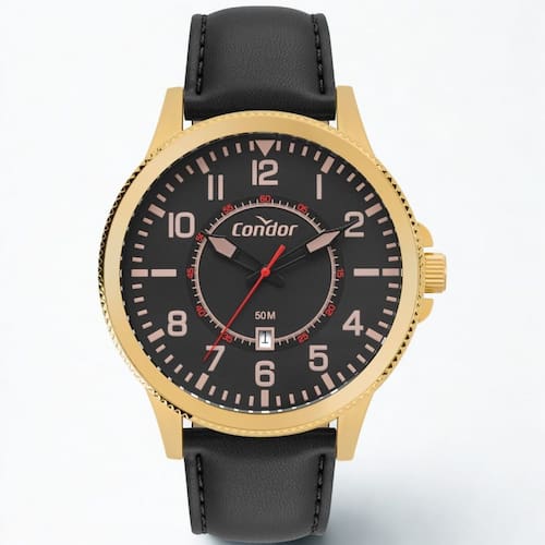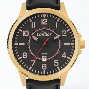 O relógio que todo homem quer está na coleção Militar da Condor. Pulseira de couro sintético preto e banho dourado. Mostrador em estilo militar preto. Relógio com detalhe de cor no segundeiro.