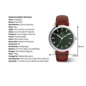 O Relógio Magnus 40mm da New Port, é a escolha ideal para homens que valorizam estilo, presença e autenticidade. Com pulseira em couro vegano marrom de acabamento premium, ele traz conforto e durabilidade para o uso diário. Sua caixa em aço prata adiciona um toque de requinte, enquanto o fundo verde oferece um contraste moderno e sofisticado. Os ponteiros com brilho noturno garantem visibilidade em qualquer ambiente, sem perder a elegância.