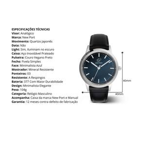 ESPECIFICAÇÕES TÉCNICAS - Visor: Analógico - Marca: New Port - Movimento: Quartzo Japonês - Data: Não - Light: Sim, iluminam no escuro - Caixa: Aço Inoxidável Prateado - Pulseira: Couro Vegano Preto - Fecho: Fivela Simples - Face: Minimalista Azul - Mostrador: Mineral Resistente - Ponteiros: 03 - Resistente: A Respingos - Bateria: 377 Com Maior Durabilidade - Design: Minimalista Elegante - Peso: 104g - Categoria: Relógio Masculino - Acompanha: Caixa da marca New Port e Manual- Garantia: 12 meses contra defeito de fabricação Após a confirmação de compra, o código de rastreio será enviado em até um dia útil em seu e-mail.