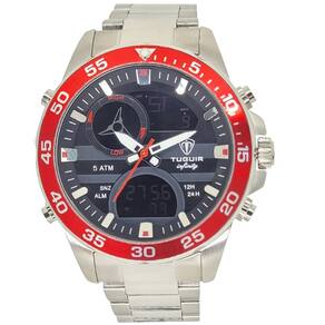Marca: Tuguir Categoria: AnaDigi Analógico: Sim (1 Horário) Ponteiros Fluorescentes: Sim Digital: Sim (1 Horário) Calendário: Sim Despertador: Sim Mostra o Dia da Semana: Sim Mostra o Dia do Mês: Sim Cronômetro: Sim Contador Regressivo: Não Luz: Sim Cor da Iluminação: Azul Resistente à Água: 5 ATM - Respingos: Sim - Chuva: Sim - Lavar Carro: Sim - Lavar Louça: Sim - Natação: Sim - Mergulho: Não Característica do Vidro: Cristal Mineral Tipo de Fecho: Dobrável com Botão Cor da Caixa: Prata Material da Caixa: Aço Formato da Caixa: Redondo Diâmetro da Caixa: 44,50 (mm) Espessura da Caixa: 14,50 (mm) Cor da Pulseira: Prata Material da Pulseira: Aço Largura da Pulseira: 20,00 (mm) Comprimento Máximo da Pulseira: 230,00 (mm) Alimentação: Bateria Interna Peso Líquido: 0,190 Kg Modelo: Infinity 1881D Cor Predominante: Prata Cor Diferencial: Vermelho Garantia: 12 Meses