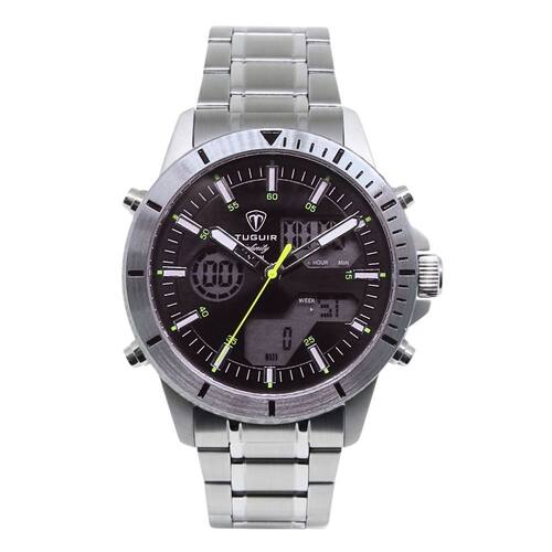 Marca: Tuguir Categoria: AnaDigi Analógico: Sim (1 Horário) Ponteiros Fluorescentes: Não Digital: Sim (1 Horário) Calendário: Sim Despertador: Sim Mostra o Dia da Semana: Sim Mostra o Dia do Mês: Sim Cronômetro: Sim Luz: Sim Cor da Iluminação: Verde Resistente à Água: 5 ATM - Respingos: Sim - Chuva: Sim - Lavar Carro: Sim - Lavar Louça: Sim - Natação: Sim - Mergulho: Não Característica do Vidro: Cristal Mineral Tipo de Fecho: Dobrável com Botão Cor da Caixa: Prata Material da Caixa: Aço Formato da Caixa: Redondo Diâmetro da Caixa: 43,00 (mm) Espessura da Caixa: 14,00 (mm) Cor da Pulseira: Prata Material da Pulseira: Aço Largura da Pulseira: 19,50 (mm) Comprimento Máximo da Pulseira: 270,00 (mm) Alimentação: Bateria Interna Peso Líquido: 0,130 Kg Modelo: GCS-1269 Cor Predominante: Prata Cor Diferencial: Preto Garantia: 12 Meses