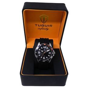 Relógio Masculino de Aço Tuguir Analógico Infinity 9169C Prata e Preto e LaranjaMarca: Tuguir Categoria: Analógico Analógico: Sim (1 Horário) Ponteiros Fluorescentes: Não Digital: Não Luz: NãoResistente à Água: 5 ATM (Pode ser utilizado para nadar no raso, por pouco tempo submerso) - Respingos: Sim - Chuva: Sim - Lavar Carro: Sim - Lavar Louça: Sim - Natação: Sim - Mergulho: Não Característica do Vidro: Cristal Mineral Tipo de Fecho: Fivela Cor da Caixa: Prata Material da Caixa: Aço Formato da Caixa: Redondo Diâmetro da Caixa: 43,00 (mm) Espessura da Caixa: 10,00 (mm) Cor da Pulseira: Preto Material da Pulseira: Silicone Largura da Pulseira: 21,50 (mm) Comprimento Máximo da Pulseira: 260,00 (mm) Alimentação: Bateria Interna Peso Líquido: 0,080 Kg Modelo: Infinity 9169C Cor Predominante: Prata Cor Diferencial: Preto e Laranja Garantia: 12 MesesConteúdo da Embalagem: 01 Relógio 01 Embalagem 01 Termo de Garantia