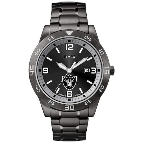 A banda de expansão ajustável de aço inoxidável de se encaixa na circunferência do pulso de até . Mostrador preto com algarismos árabes parciais e logotipo da equipe mãos luminosas Caixa de latão preta de com cristal de vidro mineral resistente a arranhões Janela de data rápida fácil de definir às 3 horas mostrador de relógio indigo iluminado Resistente à água até 50 m 165 pés em geral, adequado para curtos períodos de natação recreativa, mas não para mergulho ou snorkeling