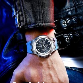 Mais do que apenas um acessório, este relógio é uma afirmação de estilo e um companheiro fiel em todas as suas aventuras. A resistência à água de até 3Bar assegura que você esteja preparado para enfrentar quaisquer intempéries, enquanto a coroa do parafuso e o cronógrafo adicionam uma dimensão de praticidade e precisão. A pulseira em silicone complementa o design inovador com conforto, mantendo-se gentil no seu pulso durante o uso prolongado. Seja um ícone de moda a cada segundo do seu dia!