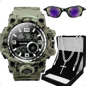Chegou o kit masculino perfeito para quem busca estilo e funcionalidade em um único produto! O Relógio Masculino Digital Orizom Spaceman é um verdadeiro destaque, com formato redondo, diâmetro da caixa de aproximadamente 4 cm e cor verde camuflado. O mostrador preto (design pode variar) e a pulseira de silicone ajustável completam o visual moderno e arrojado. Além disso, o maquinário é todo feito em acetato e à prova d'água, garantindo durabilidade e resistência.