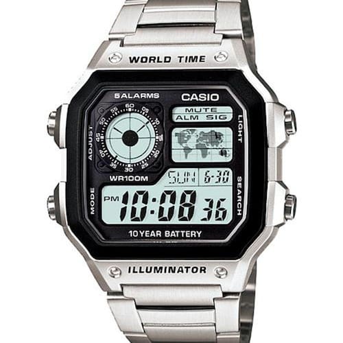 Relógio Novo e OriginalVidro com resinaAté 100 Metros à Prova D'águaMaterial do corpo/anel: resinaPulseira de Aço InoxidávelFecho triploLuz LED ÂmbarDuração de luminosidade selecionável, persistência luminosaHoras variadas (4 cidades diferentes)Hora mundial31 fusos horários (48 cidades + coordinated universal time), horário de verão (liga/desliga), troca de cidade de referência/hora mundialCronômetros de 1/100 de segundoCapacidade de medição: 23:59'59.99''Modos de medição: Tempo transcorrido, divisão de tempo, hora no 1º e 2º pontoTemporizadoresUnidade de medição: 1/10 segundoFaixa de entrada: 1 segundo a 24 horas (incrementos de 1 segundo, incrementos de 1 minuto e 1 hora)5 alarmes únicos ou diáriosSinalização a cada horaCalendário totalmente automático (até o ano 2099)Formatos 12/24 horasAtivação e desativação do tom de operação do botãoHorário regular: hora, minuto, segundo, pm (pós-meridiano), mês, data, diaDuração aprox. da bateria: 10 anos com CR2025Medidas: Caixa 4,2 cm Espessura 1,3 cm Peso 91 grs AE-1200WHD-1AVDFGARANTIA DE 12 MESESEmbalagem Manual Ean: 4971850968795