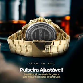 Adquira já este relógio masculino com o estilo refinado da linha Orizom Spaceman! Com um banho dourado elegante e uma construção robusta em aço inoxidável, este relógio analógico é uma escolha de alta qualidade para homens que apreciam sofisticação e durabilidade em seus acessórios.