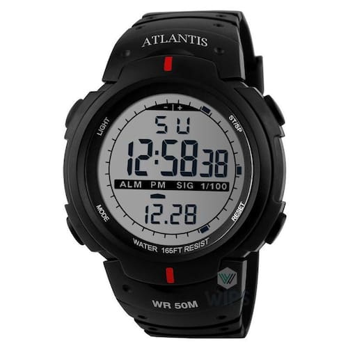 Relógio Masculino Esportivo Atlantis 7330G Digital Marca: Atlantis Modelo: 7330G Categoria: Digital Analógico: Não Digital: Sim 1 Horário Formato: 12/24h Calendário: Sim Despertador: Sim Bip de hora: Sim Mostra o Dia da Semana: Sim Mostra o Dia do Mês: Sim Cronômetro: Sim Luz: Sim Cor da Iluminação: Verde Resistente à Água: 5 ATM Pode ser Utilizado para nadar no raso, por pouco tempo submerso - Respingos: Sim - Chuva: Sim - Lavar Carro: Sim - Lavar Louça: Sim - Natação: Sim - Mergulho: Não Característica do Vidro: Acrílico Tipo de Fecho: Fivela Simples Cor da Caixa: Preta Material da Caixa: Plástico Formato da Caixa: Redondo Diâmetro da Caixa: 49,00 mm Espessura da Caixa: 14,00 mm Cor da Pulseira: Preta Material da Pulseira: Plástico Largura da Pulseira: 20,00 mm Comprimento Máximo da Pulseira: 225,00 mm Alimentação: Bateria Interna Peso Líquido: 0,051 Kg Cor Predominante: Preto Cor Diferencial: Vermelho : 3 Meses Conteúdo da Embalagem: - Relógio - Estojo do relógio Ean: 6012507568598