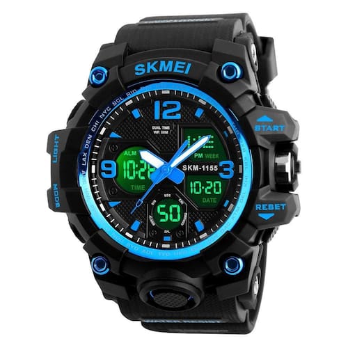 Relógio Masculino Esportivo Digital Skmei 1155 Prova D'água Cor: Azul Relógio Masculino Esportivo Digital Analógico Militar Exercito Skmei 1155B AnaDigi Grande LED Características: Marca: Skmei Modelo: 1155B Categoria: AnaDigi Analógico: Sim Ponteiros Fluorescentes: Sim Digital: Sim Formato da hora: 12/24 Despertador: Sim Bip de hora em hora: Sim Calendário: Sim Mostra o Dia da Semana: Sim Mostra o Dia do Mês: Sim Cronômetro: Sim Cronômetro Regressivo timer : Não Luz: Sim Cor da Iluminação: Verde Resistente à Água: 5BAR/5ATM/50M Pode ser Utilizado para nadar no raso, por pouco tempo submerso - Respingos: Sim - Chuva: Sim - Lavar Louça: Sim - Natação: Sim - Mergulho: Não Característica do Vidro: Resina Tipo de Fecho: Fivela Dupla Material da Caixa: Plástico Material da Pulseira: Borracha Formato da Caixa: Redondo Diâmetro da Caixa: 55 mm Espessura da Caixa: 17 mm Largura da Pulseira: 22 mm Comprimento da pulseira: 235 mm Ajustável Alimentação: Bateria Peso Líquido: 72g : 03 Meses Conteúdo da Embalagem: - Relógio - Estojo do relógio -