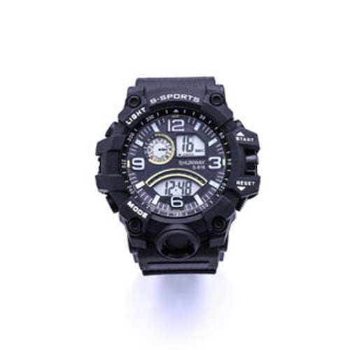 Relógio S816-01-1 Relógio de pulso masculino com design esportivo na cor preta, combinando visor analógico e digital para maior praticidade. Possui funções de hora, minutos, segundos, dia da semana, cronômetro e alarme. Conta com iluminação noturna e botões laterais para fácil ajuste das funções. Modelo robusto e confortável, ideal para uso diário, esportes e atividades ao ar livre. Funcionamento por bateria. Marca: Não Informado