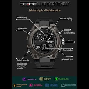 Especificações Tipo de item: relógios de pulso de quartzo Estilo: esporte Característica: calendário completo, resistente a choques, cronômetro, data automática, à prova d'água, mergulhador, cronógrafo, luz negra, múltiplos fusos horários, natação, alarme Movimento: duplo, quartzo Material da faixa: borracha - silicone Material do invólucro: liga k34 Não acompanha caixa de presente nem estojo Profundidade de resistência a água: 3bar Fecho: fivelas Comprimento da pulseira: 24cm Largura de banda: 23mm Espessura da caixa:17mm Janela dial tipo de material: resina Modelo número: 739 Diâmetro dial:55mm À prova d' água - até 30m - importante: não tomar banho quente com o relógio nem apertar nenhum botal quando submerso.
