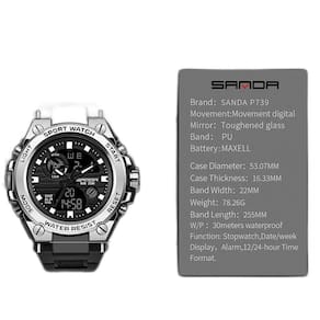 Relógio masculino esportivo sanda modelo 739 estilo militar 1545 Cor: prata Produto diretamente do distribuidor autorizado pela marca sanda, com excelente qualidade de fabricação com durabilidade incomparável devido aos ótimos materiais aplicados na fabricação. Tamanho único e ajustável Produto de luxo e com muito estilo. Não acompanha estojo. Especificações Tipo de item: relógios de pulso de quartzo Estilo: esporte Característica: calendário completo, resistente a choques, cronômetro, data automática, à prova d'água, mergulhador, cronógrafo, luz negra, múltiplos fusos horários, natação, alarme Movimento: duplo, quartzo Material da faixa: borracha - silicone Material do invólucro: liga k34 Não acompanha caixa de presente nem estojo Profundidade de resistência a água: 3bar Fecho: fivelas Comprimento da pulseira: 24cm Largura de banda: 23mm Espessura da caixa:17mm Janela dial tipo de material: resina Modelo número: 739 Diâmetro dial:55mm À prova d' água - até 30m - importante: não tomar banho quente com o relógio nem apertar nenhum botal quando submerso. Smart new tech Sanda739 Marca: Não Informado