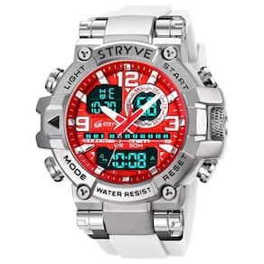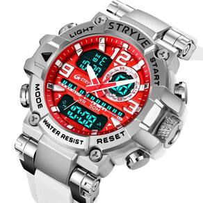 Características: Marca: Stryve Modelo: S8025 Categoria: AnaDigi Analógico: Sim Ponteiros Fluorescentes: Sim Digital: Sim 2 Horários Formato da hora: 12/24 Despertador: Sim Bip de Hora: Sim Calendário: Sim Mostra o Dia da Semana: Sim Mostra o Dia do Mês: Sim Cronômetro: Sim Cronômetro Regressivo timer : Não Luz: Sim Cor da Iluminação: Verde Resistente à Água: 5BAR/5ATM/50M não pressionar os botões quando estiver submerso - Respingos: Sim - Chuva: Sim - Lavar Louça: Sim - Natação: Sim - Mergulho: Não Característica do Vidro: Acrílico Tipo de Fecho: Fivela Dupla Material da Caixa: Plástico Material da Pulseira: Borracha Formato da Caixa: Redondo Diâmetro da Caixa: 55 mm Espessura da Caixa: 19 mm Largura da Pulseira: 22 mm Comprimento da pulseira: 270 mm Ajustável Alimentação: Bateria Peso Líquido: 111g : 03 Meses Conteúdo da Embalagem: Relógio Manual de Instruções