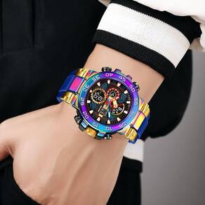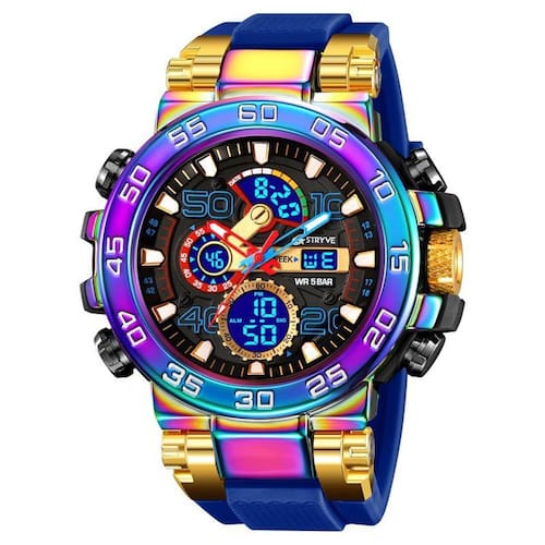 Características: Marca: Stryve Modelo: S8030 Categoria: AnaDigi Analógico: Sim Ponteiros Fluorescentes: Sim Digital: Sim 2 Horários Formato da hora: 12/24 Despertador: Sim Bip de Hora: Sim Calendário: Sim Mostra o Dia da Semana: Sim Mostra o Dia do Mês: Sim Cronômetro: Sim Cronômetro Regressivo timer : Não Luz: Sim Cor da Iluminação: Verde Resistente à Água: 5BAR/5ATM/50M não pressionar os botões quando estiver submerso - Respingos: Sim - Chuva: Sim - Lavar Louça: Sim - Natação: Sim - Mergulho: Não Característica do Vidro: Acrílico Tipo de Fecho: Fivela Simples Material da Caixa: Liga de Zinco e Plástico Material da Pulseira: Borracha Formato da Caixa: Redondo Diâmetro da Caixa: 55 mm Espessura da Caixa: 18 mm Largura da Pulseira: 22 mm Comprimento da pulseira: 270 mm Ajustável Alimentação: Bateria Peso Líquido: 110g : 03 Meses Conteúdo da Embalagem: - Relógio - Manual de Instruções