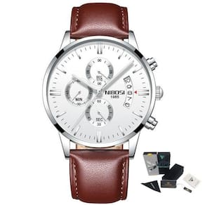 Cor: Marrom/Prata Características: Marca: Nibosi Modelo: 2309 Categoria: Analógico Estilo: Fashion e Casual Movimento: Quartzo Cronógrafo: Ponteiros funcionais Diâmetro da caixa visor : 43 mm Espessura da caixa visor : 10 mm Tamanho da pulseira: 220 mm Largura da pulseira: 22 mm Tipo de fecho: Fivela Material do Visor: Cristal hardlex Material da caixa: Aço inoxidável Material da pulseira: Couro Peso liquido: Cerca de 131 g Alimentação: Bateria Resistente à Água: 3BAR/3ATM/30M - Respingos: Sim - Chuva: Sim - Lavar Louça: Sim - Natação: Não - Mergulho: Não Garantia: 03 Meses Conteúdo da Embalagem:- Relógio- Manual de instruções em inglês- Chave para regular a pulseira do relógio- Certificado internacional de originalidade - Flanela para limpar o relógio
