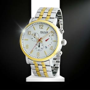 Relógio Masculino Magnum Cronógrafo MA35226S - Prata Relógio Masculino Magnum Cronógrafo Possui incrível design, deixando seu look mais despojado e elegante ao mesmo tempo. Além disso, foram confeccionados com material de primeiríssima qualidade, tornando-o resistente e durável. Características:ean: 7891511426624Marca: Magnum Modelo: MA35226SCor da caixa: PrataMaterial da caixa: AçoCor da Pulseira: Prata e douradoMaterial da pulseira: AçoVidro: Cristal MineralCor do bisel: DouradoFunções: Analógico, Cronógrafo, CalendárioResistência à água: 10 ATMDimensões da Embalagem:Altura: 10cmLargura: 14cmProfundidade: 16cmPeso: 0,500KgGarantia: 12 Meses