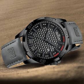 Sua pulseira em couro preto de alta qualidade oferece conforto e durabilidade, enquanto a caixa em aço inoxidável e o cristal mineral resistente garantem proteção e elegância. O visor analógico com mostrador preto e detalhes escuros reforça o visual masculino, discreto e moderno.