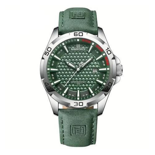 Sua pulseira em couro verde de alta qualidade oferece conforto e durabilidade, enquanto a caixa em aço inoxidável e o cristal mineral resistente garantem proteção e elegância. O visor analógico com mostrador verde e detalhes reforça o visual masculino, discreto e moderno.
