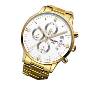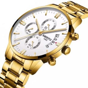 Relógio Masculino Nibosi 2309 Analógico Dourado/Branco Cor: Dourado/Branco Características: Marca: Nibosi Modelo: 2309 Categoria: Analógico Estilo: Fashion e Casual Movimento: Quartzo Cronógrafo: Ponteiros funcionais Calendário: Sim Diâmetro da caixa visor : 43 mm Espessura da caixa visor : 10,5 mm Tamanho da pulseira: 21 cm Largura da pulseira: 20 mm Tipo de fecho: Borboleta Ponteiros luminosos: sim Material do Visor: Cristal hardlex Material da caixa: Aço inoxidável Material da pulseira: Aço inoxidável Peso liquido: Cerca de 135g Alimentação: Bateria Resistente à Água: 3BAR/3ATM/30M - Respingos: Sim - Chuva: Sim - Lavar Louça: Sim - Natação: Não - Mergulho: Não : 03 Meses Conteúdo da Embalagem: - Relógio - Manual de instruções em inglês - Chave para regular a pulseira do relógio - Certificado internacional de originalidade - Flanela para limpar o relógio Ean: 6012507557592