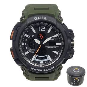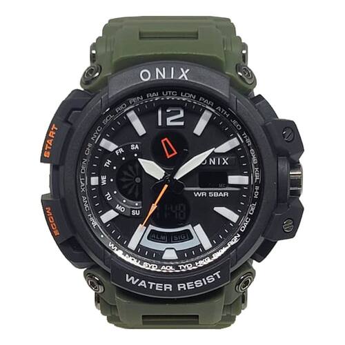 Relógio Masculino Onix AnaDigi OX124 Verde e PretoMarca: Onix Categoria: Calendário: Sim Despertador: Sim Mostra o Dia da Semana: Sim Mostra o Dia do Mês: Sim Cronômetro: Não Contador Regressivo: Não Luz: Sim Cor da Iluminação: VerdeResistente à Água: 5 ATM (Pode ser utilizado para nadar no raso, por pouco tempo submerso) - Respingos: Sim - Chuva: Sim - Lavar Carro: Sim - Lavar Louça: Sim - Natação: Sim - Mergulho: Não Característica do Vidro: Acrílico Tipo de Fecho: Fivela Cor da Caixa: Preto Material da Caixa: Plástico Formato da Caixa: Redondo Diâmetro da Caixa: NaN (mm) Espessura da Caixa: NaN (mm) Cor da Pulseira: Verde Material da Pulseira: Plástico Largura da Pulseira: 54,00 (mm) Comprimento Máximo da Pulseira: 18,50 (mm) Alimentação: Bateria Interna Peso Líquido: 0,057 Kg Modelo: OX124 Cor Predominante: Verde Cor Diferencial: Preto Garantia: 12 MesesConteúdo da Embalagem: 01 Relógio 01 Embalagem 01 Termo de Garantia Ean: 7891368317014