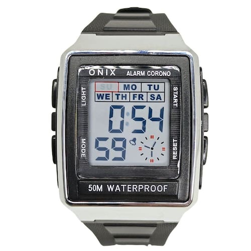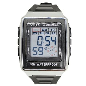 Marca: Onix Categoria: Digital Analógico: Não Digital: Sim (1 Horário) Calendário: Sim Despertador: Sim Mostra o Dia da Semana: Sim Mostra o Dia do Mês: Sim Cronômetro: Sim Luz: Sim Cor da Iluminação: Verde Resistente à Água: 5 ATM - Respingos: Sim - Chuva: Sim - Lavar Carro: Sim - Lavar Louça: Sim - Natação: Sim - Mergulho: Não Característica do Vidro: Acrílico Tipo de Fecho: Fivela Cor da Caixa: Prata Material da Caixa: Plástico Formato da Caixa: Quadrado Comprimento da Caixa: 40,00 (mm) Largura da Caixa: 36,00 (mm) Espessura da Caixa: 14,50 (mm) Cor da Pulseira: Preto Material da Pulseira: Plástico Largura da Pulseira: 20,00 (mm) Comprimento Máximo da Pulseira: 250,00 (mm) Alimentação: Bateria Interna Peso Líquido: 0,040 Kg Modelo: IT-1805 Cor Predominante: Prata Cor Diferencial: Preto Garantia: 12 Meses