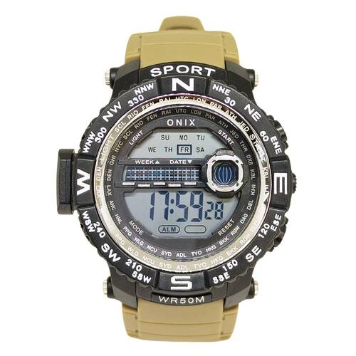 Relógio Masculino Onix Digital IT-889(0106) Preto e BegeMarca: Onix Categoria: Digital Analógico: Não Digital: Sim (1 Horário) Calendário: Sim Mostra o Dia da Semana: Sim Cronômetro: Sim Luz: Sim Cor da Iluminação: VerdeResistente à Água: 5 ATM (Pode ser utilizado para nadar no raso, por pouco tempo submerso) - Respingos: Sim - Chuva: Sim - Lavar Carro: Sim - Lavar Louça: Sim - Natação: Sim - Mergulho: Não Característica do Vidro: Acrílico Tipo de Fecho: Fivela Cor da Caixa: Preto Material da Caixa: Plástico Formato da Caixa: Redondo Diâmetro da Caixa: 48,00 (mm) Espessura da Caixa: 17,00 (mm) Cor da Pulseira: Bege Material da Pulseira: Borracha Largura da Pulseira: 19,50 (mm) Comprimento Máximo da Pulseira: 250,00 (mm) Alimentação: Bateria Interna Peso Líquido: 0,055 Kg Modelo: IT-889(0106) Cor Predominante: Preto Cor Diferencial: Bege Garantia: 12 MesesConteúdo da Embalagem: 01 Relógio 01 Embalagem 01 Termo de Garantia