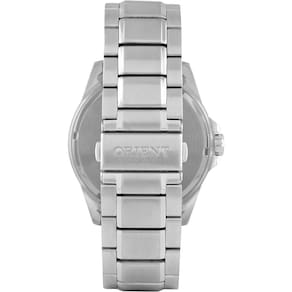 Relógio com sistema analógico com ponteiros indicando as horas, minutos e segundos. Possui calendário diário, indicadores tracejados. Caixa em aço com fundo personalizado no tom, pino para ajuste de horas e vidro em cristal mineral. Pulseira em aço trabalhado com fechamento por fivela de pressão.