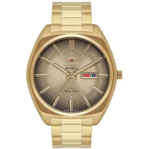 Relógio orient masculino ref: f49gg025 c1kx automático dourado Descrição do produto: Linha: orient automatic três estrelas Vidro: cristal mineral Funções: automático, analógico, calendário mensal, calendário semanal com opção em português Resistência à água: 50 m Características: com caixa aço inoxidável e pulseira aço inoxidável Diâmetro da caixa: 4,3 cm Alimentação do maquinário: mecânico automático Mostrador champanhe degradê Garantia de 1 ano