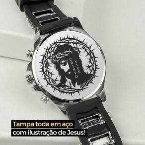 - Relógio Masculino Orizom Spaceman: Com maquinário em aço inoxidável prata, mostrador prata e pulseira ajustável em silicone preto. A tampa traseira traz uma arte exclusiva de Jesus Cristo, reforçando a autenticidade e a temática espiritual do modelo.