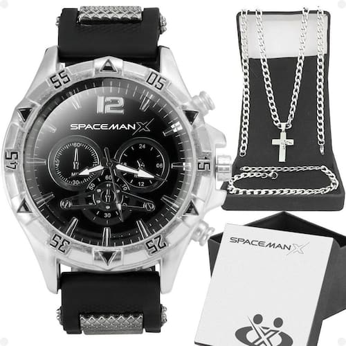 Relogio masculino prata + cordão grumet + pulseira + caixa Kit especial orizom spaceman x: surpreenda quem você ama
