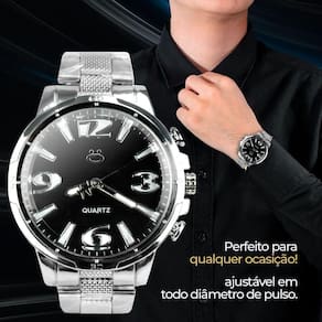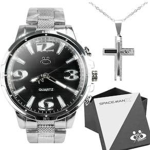 "Chegou o relógio analógico prateado da Orizom Spaceman, com um design moderno e elegante! Com fundo preto e estrutura em aço inoxidável, este relógio oferece uma leitura descomplicada, ideal para o dia a dia. Atente-se apenas para o contato excessivo com água, pois ele não é à prova d'água.Além disso, este conjunto inclui um colar com a Oração Pai Nosso, adicionando um toque especial e significativo ao seu estilo. E para completar, o conjunto acompanha uma caixa exclusiva Orizom Spaceman, perfeita para presentear com estilo e sofisticação.Surpreenda alguém querido com este elegante conjunto de relógio e colar, expressando carinho e cuidado. Ideal para presentear em diversas ocasiões, este conjunto oferece um toque de sofisticação e significado. Aproveite para adquirir o seu hoje mesmo e desfrute de toda a qualidade e beleza que a Orizom Spaceman tem a oferecer!"