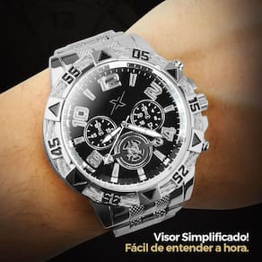 - 1 Relógio Analógico Masculino Orizom Spaceman X: formato redondo, todo prateado, feito em aço inoxidável, mostrador preto (ou azul), com arte detalhada na tampa.