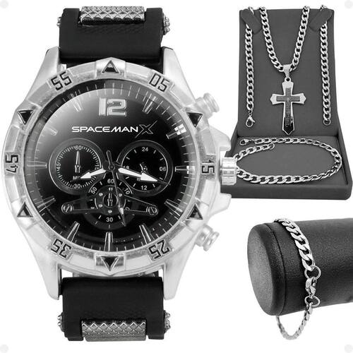 Relogio masculino prateado + cordão prata grumet crucifixo Kit Especial Orizom Spaceman X para Presentear Quem Você Ama