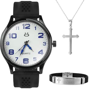 Relogio masculino preto aço + pulseira + cordao crucifixo preto pesado ponteiro robusto black piano kit de Acessórios Masculino Orizom - Linha Jesus Se você aprecia estilo, autenticidade e simbolismo, este elegante kit de acessórios masculinos Orizom é perfeito para você. Composto por um relógio premium, cordão, pingente e pulseira, este conjunto é ideal tanto para uso próprio quanto para presentear alguém especial. Relógio Masculino Orizom Spaceman - Tipo: Analógico - Modelo: Spaceman - Qualidade: Premium - Material: Maquinário em aço inoxidável com pintura eletrostática preta black piano , garantindo durabilidade e resistência - Formato: Redondo - Mostrador: Branco podendo ser enviado na cor prata - Pulseira: Silicone preto, ajustável e compatível com qualquer dimensão de pulso - Tampa: Blindada com arte exclusiva da linha de Jesus, assegurando autenticidade e exclusividade Cordão Prata - Material: Aço inoxidável prata - Comprimento: Aproximadamente 65 cm - Design versátil e atemporal, perfeito para combinar com o relógio e outros acessórios do kit Pingente Cruz - Material: Aço inoxidável em formato de cruz - Detalhe: Símbolo discreto e elegante, pode ser Utilizado no cordão ou em outra corrente à sua escolha Pulseira em Silicone com Pingente Prata e Oração - Material: Silicone preto com pingente em aço inoxidável prata - Detalhe: Oração do Pai Nosso gravada a laser, proporcionando um toque pessoal e espiritual ao acessório - Comprimento: Aproximadamente 25 cm, com possibilidade de ajuste pelo próprio comprador cortando o silicone para um encaixe perfeito Este kit reúne estilo, qualidade e simbolismo em um conjunto exclusivo da marca Orizom, ideal para quem busca acessórios modernos e significativos para qualquer ocasião. Garanta já o seu kit e adicione um toque único ao seu estilo