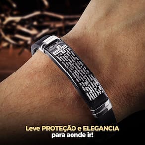 Pulseira em Silicone com Oração: Esta pulseira preta ajustável possui uma placa em aço inoxidável com a oração do Pai Nosso gravada a laser, proporcionando um toque espiritual ao seu look.