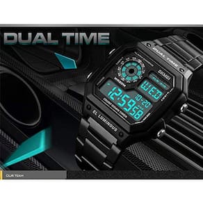 Relógio masculino preto, clássico, quadrado, multifuncional, digital, esporte, alarme de contagem regressiva, LED, pulseira de aço inoxidável, relógio de pulso para homens