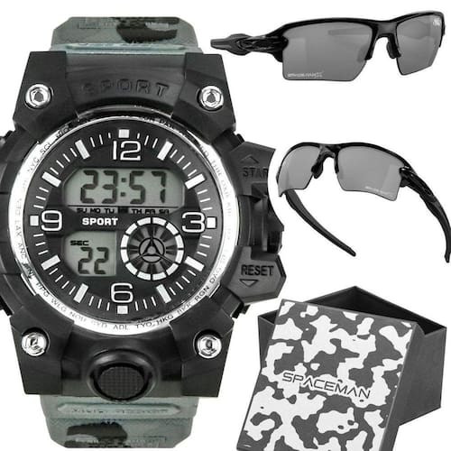 Chegou o kit masculino que vai transformar o visual e a rotina de qualquer homem O relógio digital Orizom Spaceman, com seu design camuflado único e resistência à prova d'água, é a escolha perfeita para os aventureiros urbanos que não abrem mão de estilo e funcionalidade. Combine isso com o par de óculos de sol premium Orizom Spaceman X, feito em acetato com proteção UV, e tenha a garantia de conforto e proteção para os olhos em qualquer atividade ao ar livre.