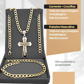 Inclui também: Cordão Grumet em aço inoxidável banhado, estilo robusto e elegante Pingente em forma de cruz em aço inoxidável banhado, com detalhes e a oração do Pai Nosso gravada a laser Pulseira estilo Grumet harmonizada com o cordão, trazendo unidade e sofisticação ao conjunto