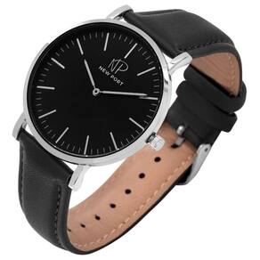 Relógio Masculino New Port Preto Pulseira De Couro Sintético Riverside Minimalista 40mm de diâmetro. A caixa é de metal prateada e o mostrador preto, vidro com mineral endurecido com alta resistência.