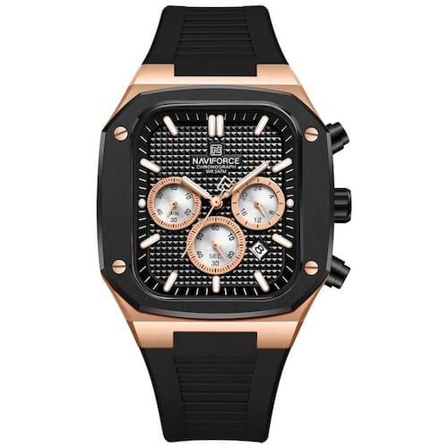Descubra a elegância atemporal e moderna deste magnífico relógio de quartzo combina perfeitamente a funcionalidade desportiva com o charme sofisticado dos acessórios masculinos. Equipado com uma pulseira de silicone resistente, este relógio não só oferece conforto superior no uso diário, mas também garante durabilidade em todas as suas aventuras. Um companheiro estiloso, que tem um design quadrado integrado, oferecendo uma estética exclusiva, enquanto as mãos luminosas garantem visibilidade até nos ambientes mais escuros. Reforce seu estilo com um relógio à prova d'água que também apresenta data automática, cronógrafo e calendário completo.