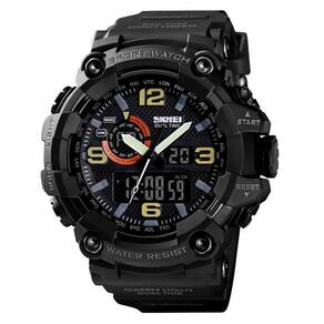 Relógio Masculino Skmei AnaDigi 1520 Preto Relógio Masculino Skmei AnaDigi 1520 - Preto Marca: Skmei Categoria: AnaDigi Analógico: Sim 1 Horário Ponteiros Fluorescentes: Sim Digital: Sim 1 Horário Calendário: Sim Despertador: Sim Mostra o Dia da Semana: Sim Mostra o Dia do Mês: Sim Cronômetro: Sim Contador Regressivo: Não Luz: Sim Cor da Iluminação: Verde Resistente à Água: 5 ATM Pode ser Utilizado para nadar no raso, por pouco tempo submerso - Respingos: Sim - Chuva: Sim - Lavar Carro: Sim - Lavar Louça: Sim - Natação: Sim - Mergulho: Não Característica do Vidro: Selecione Tipo de Fecho: Fivela Cor da Caixa: Preto Material da Caixa: Plástico Formato da Caixa: Redondo Diâmetro da Caixa: 50,00 mm Espessura da Caixa: 19,20 mm Cor da Pulseira: Preto Material da Pulseira: Plástico Largura da Pulseira: 21,00 mm Comprimento Máximo da Pulseira: 240,00 mm Alimentação: Bateria Interna Peso Líquido: 0,080 Kg Modelo: 1520 Cor Predominante: Preto : 12 Meses Conteúdo da Embalagem: 01 Relógio 01 Embalagem 01 Termo de Ean: 7896575098145