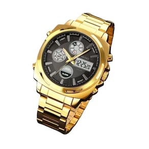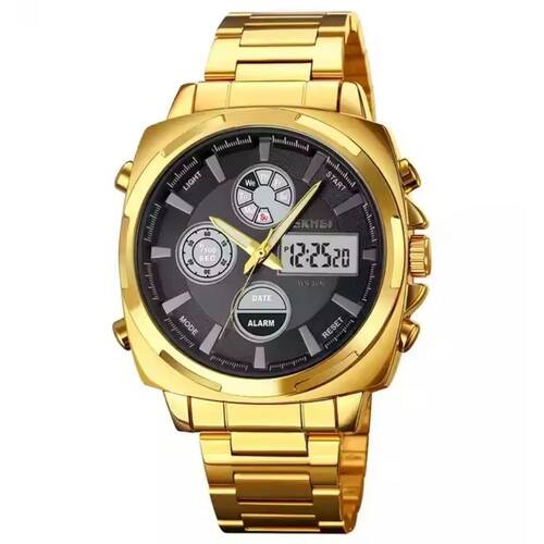 Relógio Masculino Skmei AnaDigi 1673G Dourado Marca: SkmeiCategoria: AnaDigiAnalógico: Sim (1 Horário)Ponteiros Fluorescentes: SelecioneDigital: Sim (1 Horário)Calendário: SimDespertador: SimMostra o Dia da Semana: SimMostra o Dia do Mês: SimCronômetro: SimLuz: SimCor da Iluminação: VerdeResistente à Água: 3 ATM (Resiste a imersões breves)- Respingos: Sim- Chuva: Sim- Lavar Carro: Sim- Lavar Louça: Sim- Natação: Não- Mergulho: NãoCaracterística do Vidro: Cristal MineralTipo de Fecho: Dobrável com BotãoCor da Caixa: DouradoMaterial da Caixa: Metal Banho IPFormato da Caixa: RedondoDiâmetro da Caixa: 44,00 (mm)Espessura da Caixa: 16,00 (mm)Cor da Pulseira: DouradoMaterial da Pulseira: AçoLargura da Pulseira: 21,00 (mm)Comprimento Máximo da Pulseira: 270,00 (mm)Alimentação: Bateria InternaPeso Líquido: 0,140 KgModelo: 1673GCor Predominante: DouradoGarantia: 12 MesesConteúdo da Embalagem: 01 Relógio 01 Embalagem 01 Termo de Garantia