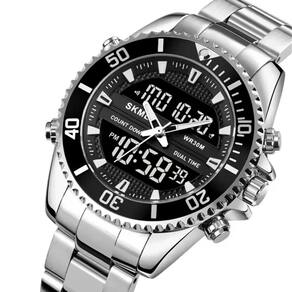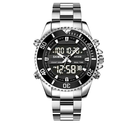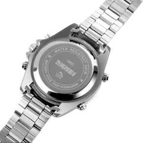 Relógio Masculino Skmei AnaDigi 1850 Prata e PretoMarca: Skmei Categoria: AnaDigi Analógico: Sim (1 Horário) Ponteiros Fluorescentes: Selecione Digital: Sim (2 Horário) Calendário: Sim Despertador: Sim Mostra o Dia da Semana: Sim Mostra o Dia do Mês: Sim Cronômetro: Sim Contador Regressivo: Sim Luz: Sim Cor da Iluminação: AzulResistente à Água: 3 ATM (Resiste a imersões breves) - Respingos: Sim - Chuva: Sim - Lavar Carro: Sim - Lavar Louça: Sim - Natação: Não - Mergulho: Não Característica do Vidro: Cristal Mineral Tipo de Fecho: Dobrável com Botão Cor da Caixa: Prata Material da Caixa: Metal Banho IP Formato da Caixa: Redondo Diâmetro da Caixa: 42,00 (mm) Espessura da Caixa: 15,00 (mm) Cor da Pulseira: Prata Material da Pulseira: Aço Largura da Pulseira: 18,00 (mm) Comprimento Máximo da Pulseira: 280,00 (mm) Alimentação: Bateria Interna Peso Líquido: 0,126 Kg Modelo: 1850 Cor Predominante: Prata Cor Diferencial: Preto Garantia: 12 MesesConteúdo da Embalagem: 01 Relógio 01 Embalagem 01 Termo de Garantia