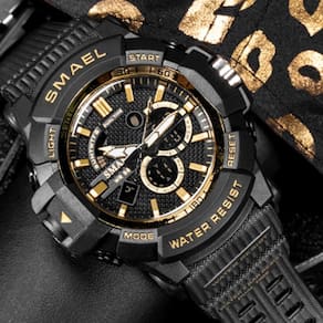 Relógio Masculino Smael AnaDigi 1809 Preto e Dourado Relógio Masculino Smael AnaDigi 1809 Preto e Dourado Marca: Smael Categoria: AnaDigi ógico: Sim 1 Horário Ponteiros Fluorescentes: Não Digital: Sim 1 Horário Calendário: Sim Despertador: Sim Mostra o Dia da Semana: Sim Mostra o Dia do Mês: Sim Cronômetro: Sim Contador Regressivo: Não Luz: Sim Cor da Iluminação: Verde Resistente à Água: 5 ATM Pode ser para nadar no raso, por pouco tempo submerso - Respingos: Sim - Chuva: Sim - Lavar Carro: Sim - Lavar Louça: Sim - Natação: Sim - Mergulho: Não Característica do Vidro: Selecione Tipo de Fecho: Selecione Cor da Caixa: Preto Material da Caixa: Plástico Formato da Caixa: Redondo Diâmetro da Caixa: 52,00 mm Espessura da Caixa: 18,00 mm Cor da Pulseira: Preto Material da Pulseira: Borracha Largura da Pulseira: 22,00 mm Comprimento Máximo da Pulseira: 240,00 mm Alimentação: Bateria Interna Peso Líquido: 0,075 Kg Modelo: 1809 Cor Predominante: Preto Cor Diferencial: Dourado : 12 Meses Conteúdo da Embalagem: 01 Relógio 01 Embalagem 01 Termo de Marca: Não Informado