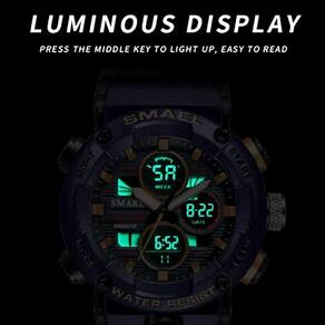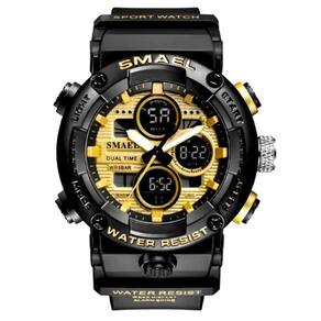 Relógio Masculino Smael AnaDigi 8038 Preto e Dourado Marca: Smael Categoria: AnaDigi ógico: Sim 1 Horário Ponteiros Fluorescentes: Sim Digital: Sim 1 Horário Calendário: Sim Despertador: Sim Mostra o Dia da Semana: Sim Mostra o Dia do Mês: Sim Cronômetro: Sim Luz: Sim Cor da Iluminação: Verde Resistente à Água: 5 ATM Pode ser para nadar no raso, por pouco tempo submerso - Respingos: Sim - Chuva: Sim - Lavar Carro: Sim - Lavar Louça: Sim - Natação: Sim - Mergulho: Não Característica do Vidro: Acrílico Tipo de Fecho: Fivela Cor da Caixa: Preto Material da Caixa: Plástico Formato da Caixa: Redondo Diâmetro da Caixa: 48,30 mm Espessura da Caixa: 17,00 mm Cor da Pulseira: Preto Material da Pulseira: Silicone Largura da Pulseira: 21,00 mm Comprimento Máximo da Pulseira: 240,00 mm Alimentação: Bateria Interna Peso Líquido: 0,065 Kg Modelo: 8038 Cor Predominante: Preto Cor Diferencial: Dourado : 12 Meses Conteúdo da Embalagem: 01 Relógio 01 Embalagem 01 Termo de Marca: Não Informado