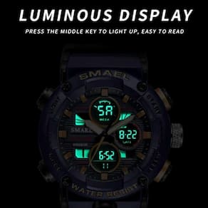 Relógio Masculino Smael AnaDigi 8038 Preto e Dourado Marca: Smael Categoria: AnaDigi ógico: Sim 1 Horário Ponteiros Fluorescentes: Sim Digital: Sim 1 Horário Calendário: Sim Despertador: Sim Mostra o Dia da Semana: Sim Mostra o Dia do Mês: Sim Cronômetro: Sim Luz: Sim Cor da Iluminação: Verde Resistente à Água: 5 ATM Pode ser para nadar no raso, por pouco tempo submerso - Respingos: Sim - Chuva: Sim - Lavar Carro: Sim - Lavar Louça: Sim - Natação: Sim - Mergulho: Não Característica do Vidro: Acrílico Tipo de Fecho: Fivela Cor da Caixa: Preto Material da Caixa: Plástico Formato da Caixa: Redondo Diâmetro da Caixa: 48,30 mm Espessura da Caixa: 17,00 mm Cor da Pulseira: Preto Material da Pulseira: Silicone Largura da Pulseira: 21,00 mm Comprimento Máximo da Pulseira: 240,00 mm Alimentação: Bateria Interna Peso Líquido: 0,065 Kg Modelo: 8038 Cor Predominante: Preto Cor Diferencial: Dourado : 12 Meses Conteúdo da Embalagem: 01 Relógio 01 Embalagem 01 Termo de Marca: Não Informado Ean: 7891368315065
