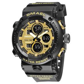 Relógio Masculino Smael AnaDigi 8038 Preto e Dourado Marca: Smael Categoria: AnaDigi ógico: Sim 1 Horário Ponteiros Fluorescentes: Sim Digital: Sim 1 Horário Calendário: Sim Despertador: Sim Mostra o Dia da Semana: Sim Mostra o Dia do Mês: Sim Cronômetro: Sim Luz: Sim Cor da Iluminação: Verde Resistente à Água: 5 ATM Pode ser para nadar no raso, por pouco tempo submerso - Respingos: Sim - Chuva: Sim - Lavar Carro: Sim - Lavar Louça: Sim - Natação: Sim - Mergulho: Não Característica do Vidro: Acrílico Tipo de Fecho: Fivela Cor da Caixa: Preto Material da Caixa: Plástico Formato da Caixa: Redondo Diâmetro da Caixa: 48,30 mm Espessura da Caixa: 17,00 mm Cor da Pulseira: Preto Material da Pulseira: Silicone Largura da Pulseira: 21,00 mm Comprimento Máximo da Pulseira: 240,00 mm Alimentação: Bateria Interna Peso Líquido: 0,065 Kg Modelo: 8038 Cor Predominante: Preto Cor Diferencial: Dourado : 12 Meses Conteúdo da Embalagem: 01 Relógio 01 Embalagem 01 Termo de Marca: Não Informado Ean: 7891368315065