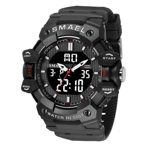 Relógio Masculino Smael AnaDigi 8080 Preto Relógio Masculino Smael AnaDigi 8080 Preto Marca: Smael Categoria: AnaDigi ógico: Sim 1 Horário Ponteiros Fluorescentes: Não Digital: Sim 1 Horário Calendário: Sim Despertador: Sim Mostra o Dia da Semana: Sim Mostra o Dia do Mês: Sim Cronômetro: Sim Contador Regressivo: Não Luz: Sim Cor da Iluminação: Azul Resistente à Água: 5 ATM Pode ser para nadar no raso, por pouco tempo submerso - Respingos: Sim - Chuva: Sim - Lavar Carro: Sim - Lavar Louça: Sim - Natação: Sim - Mergulho: Não Característica do Vidro: Acrílico Tipo de Fecho: Fivela Cor da Caixa: Preto Material da Caixa: Plástico Formato da Caixa: Redondo Diâmetro da Caixa: 56,00 mm Espessura da Caixa: 19,00 mm Cor da Pulseira: Preto Material da Pulseira: Borracha Largura da Pulseira: 21,00 mm Comprimento Máximo da Pulseira: 240,00 mm Alimentação: Bateria Interna Peso Líquido: 0,070 Kg Modelo: 8080 Cor Predominante: Preto : 12 Meses Conteúdo da Embalagem: 01 Relógio 01 Embalagem 01 Termo de Marca: Não Informado
