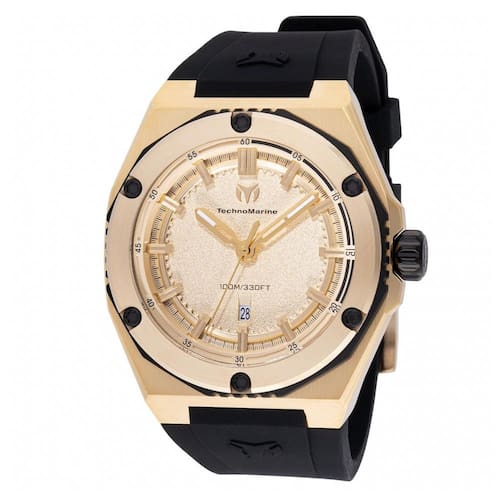 Este relógio TechnoMarine da coleção Coral Legacy é um verdadeiro destaque, impulsionado por um movimento Quartz preciso, com caixa preta e dourada. Seu mostrador é decorado por um elegante mostrador dourado em metal, protegido por um resistente cristal mineral. Uma pulseira preta completa esta peça que pode resistir à água por até 100 metros. Cada relógio é construído para os destemidos, sendo um exemplo de versatilidade, estabelecendo um precedente para enfrentar as atividades mais aventureiras.