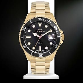 Relógio Masculino Technos Acqua Analógico 2415DW/1P Dourado A linha Acqua com o clássico design para mergulho. Ele possui elementos indispensáveis para aventuras submersas, como o aro externo giratório com acabamento corrugado e lente antireflexo com lupa de calendário, além do mostrador com ponteiros e marcadores de hora luminescentes. Seu mostrador ainda conta com um acabamento degradê colorido e formas geométricas nos marcadores de hora. Produto em aço inoxidável, com máquina quartz japonesa, calendário e resistência à água de até 15 ATM. Características:ean: 7891530824609Marca: TechnosModelo: 2415DW/1PCor da Caixa: DouradoCor da Pulseira: DouradoMaterial da Caixa: MetalMaterial da Pulseira: AçoCor do Mostrador: PretoResistência à água: 15 ATMMecanismo: AnalógicoFunções: Calendário com dataDimensões da Embalagem:Altura: 8cmLargura: 12cmProfundidade: 16cmPeso: 0,400KgGarantia: 12 Meses